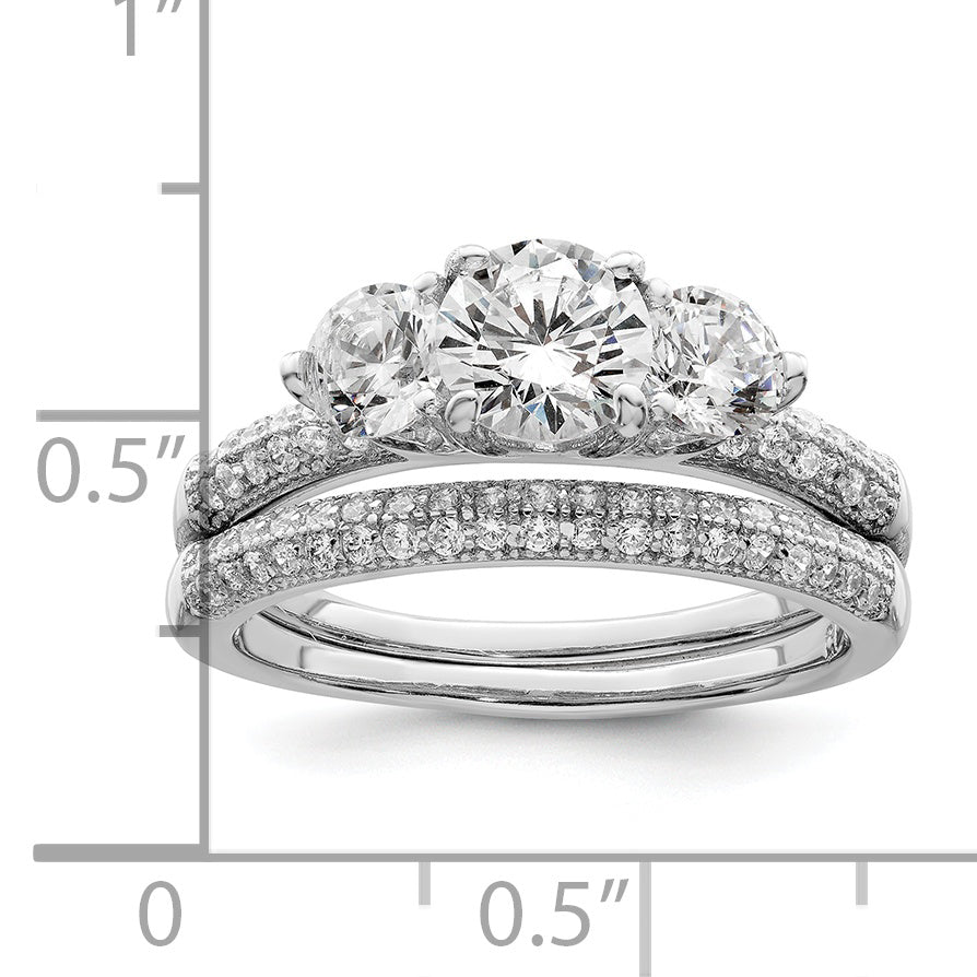 Sterling Silver Rhodium-plated CZ 3 Stone Pave Band Engagement Ring Set