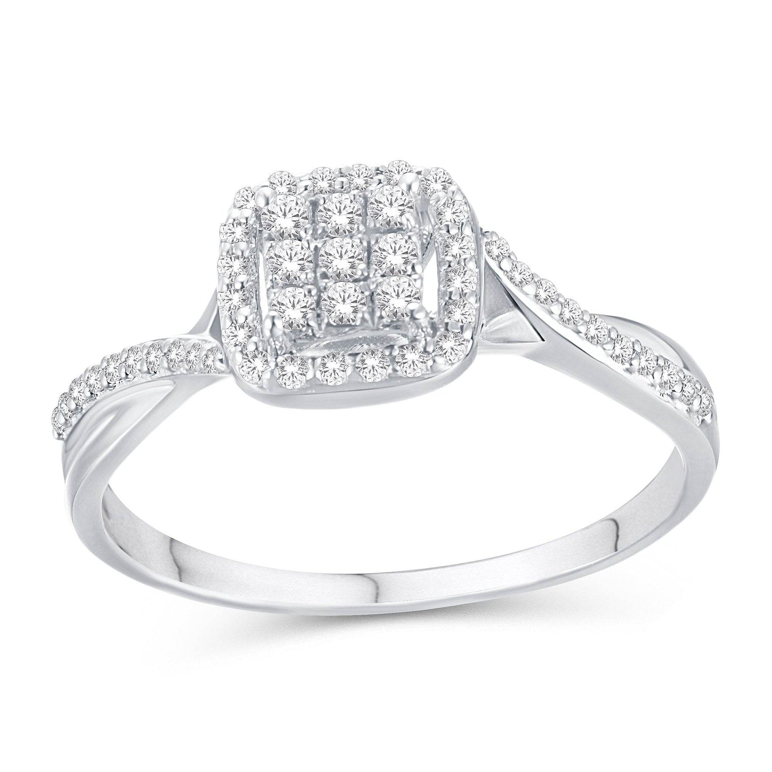 Unit price perA cluster of several Round-cut diamonds shines brilliantly on an Floating Cushion design Ladies ring. The diamonds held in Micro Prong setting dazzle with their sheer brilliance along the twisted shank. This charming diamond ring in 10 Karat White Gold is designed to delight.