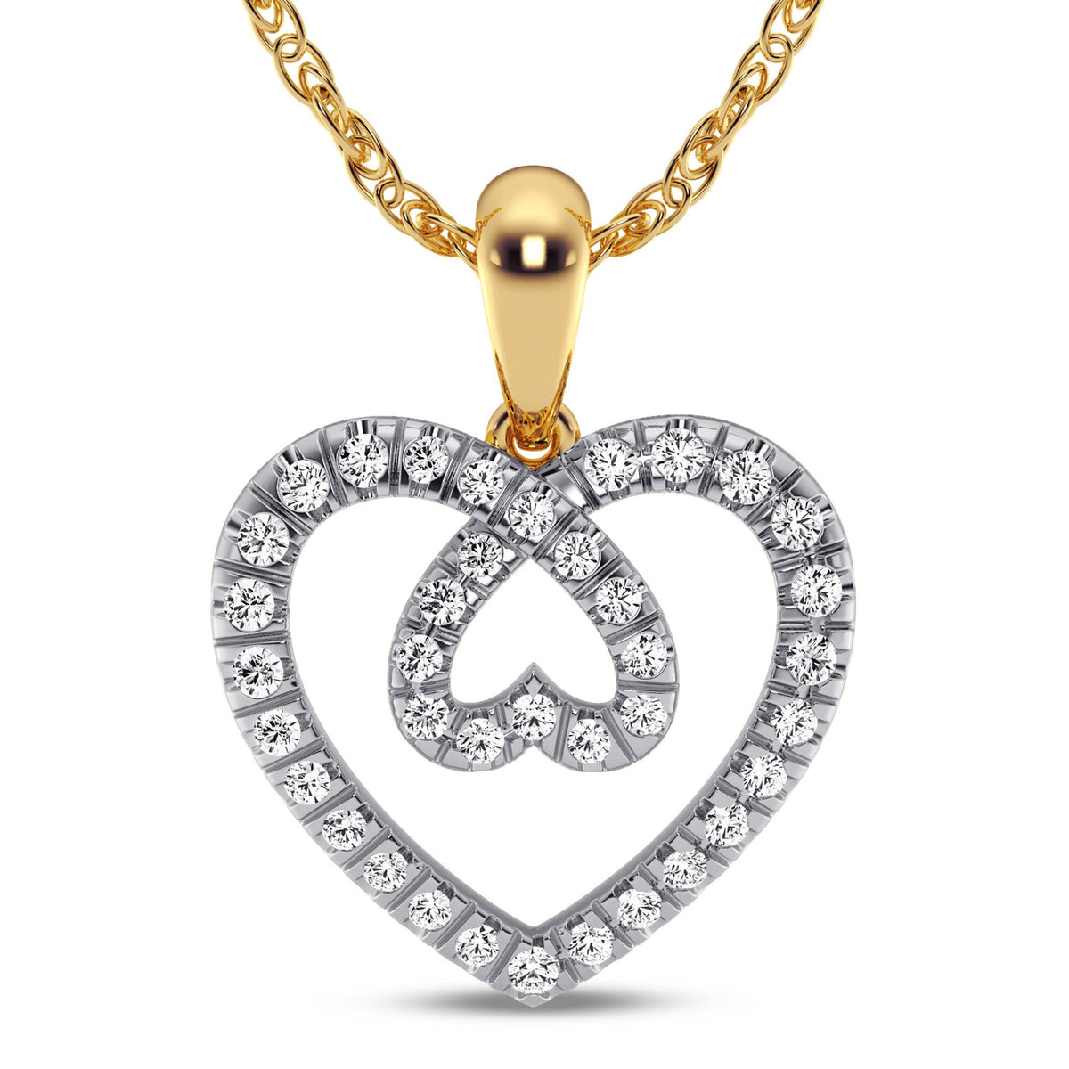 An adorable infinity love knot is enclosed in a sparkling heart frame that is set with priceless diamonds. The prong-set diamonds on the frame complement the glossy heart knot in a stunning way. This 10 Karat Yellow gold diamond twin heart pendant features a gorgeous design.