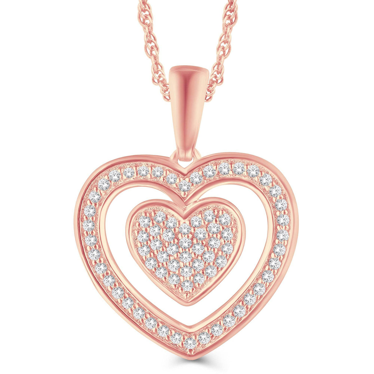 A cluster of several White diamonds shines brilliantly on a floating double heart frame. The diamonds held in a prong setting dazzle with their sheer brilliance. This charming diamond heart pendant in 10 Karat All Rose gold is designed to delight.