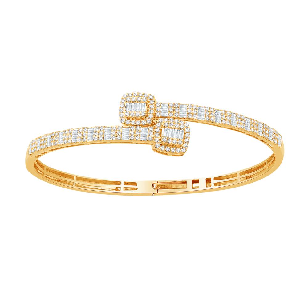 Wrap your wrist in luxury with our 14 Karat Yellow Gold Bangle, showcasing a stunning 1.53 Carat Diamonds in a cushion bypass design. Elevate your ensemble with timeless elegance and exquisite craftsmanship.