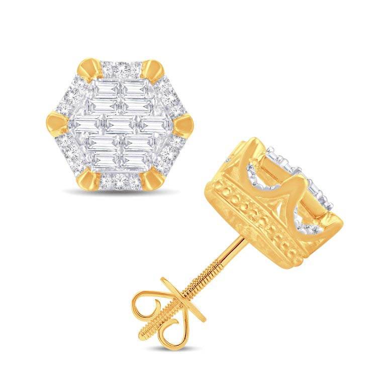 Unit price perRevel in the geometric artistry of these earrings set in 10 Karat Two-Tone (Yellow and White) Gold embedded with Round cut and Baguette diamonds in Micro Prong setting. Geometric perfection and pristine diamonds work together seamlessly to give you this dazzling pair of earrings.