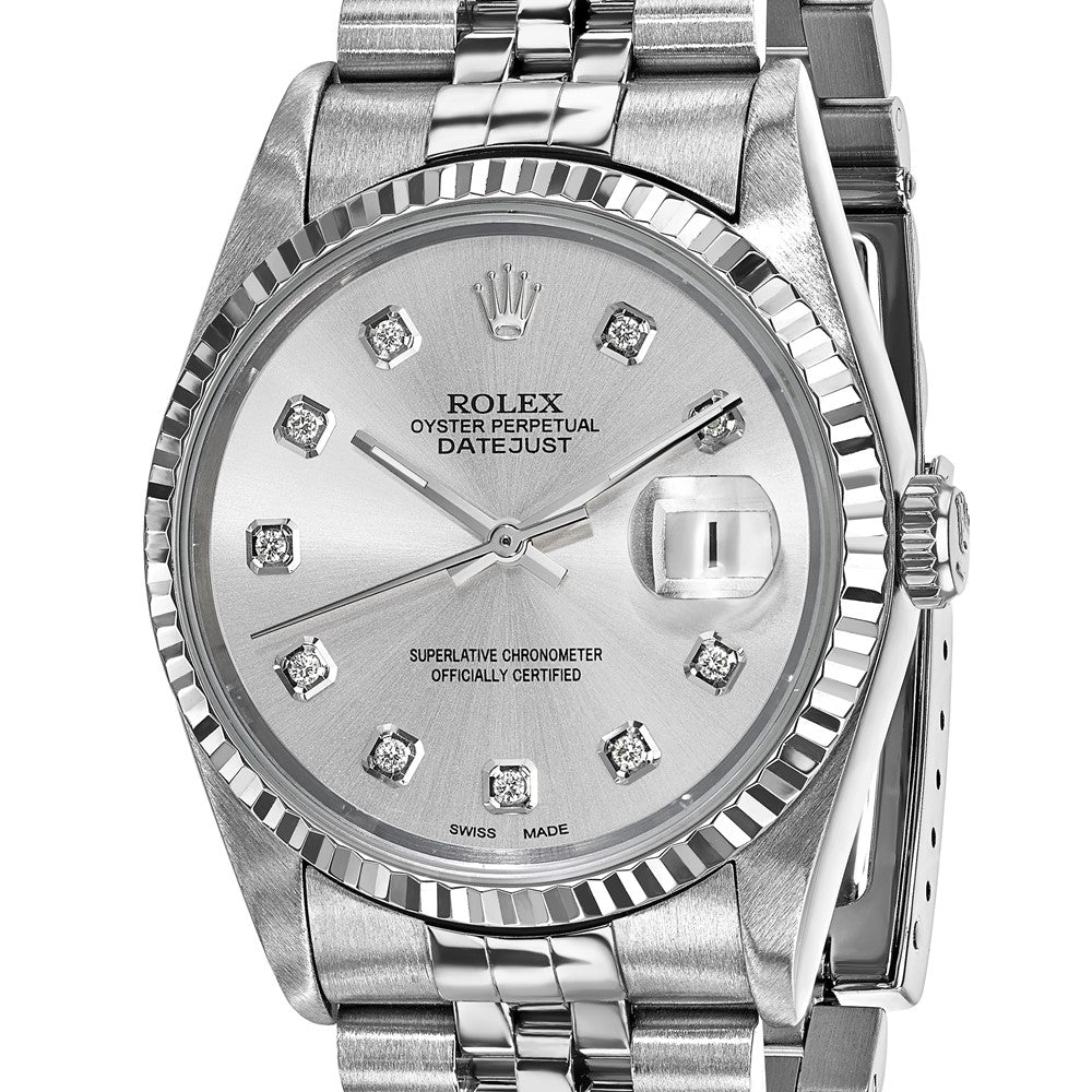 This pre-owned Rolex Date just combines timeless elegance with independently certified quality. The 36mm stainless steel case features an 18K white gold fluted bezel and silver dial adorned with ten VS clarity natural diamonds (G-H color) as hour markers. Powered by an automatic movement with quickset date function, this Swiss-made timepiece arrives with a 2-year limited warranty and original hinged box packaging.