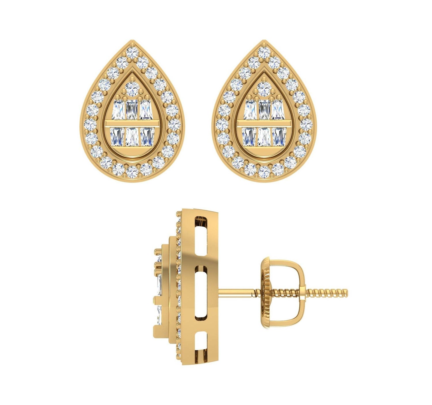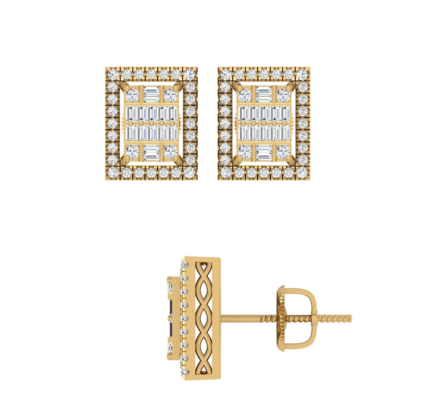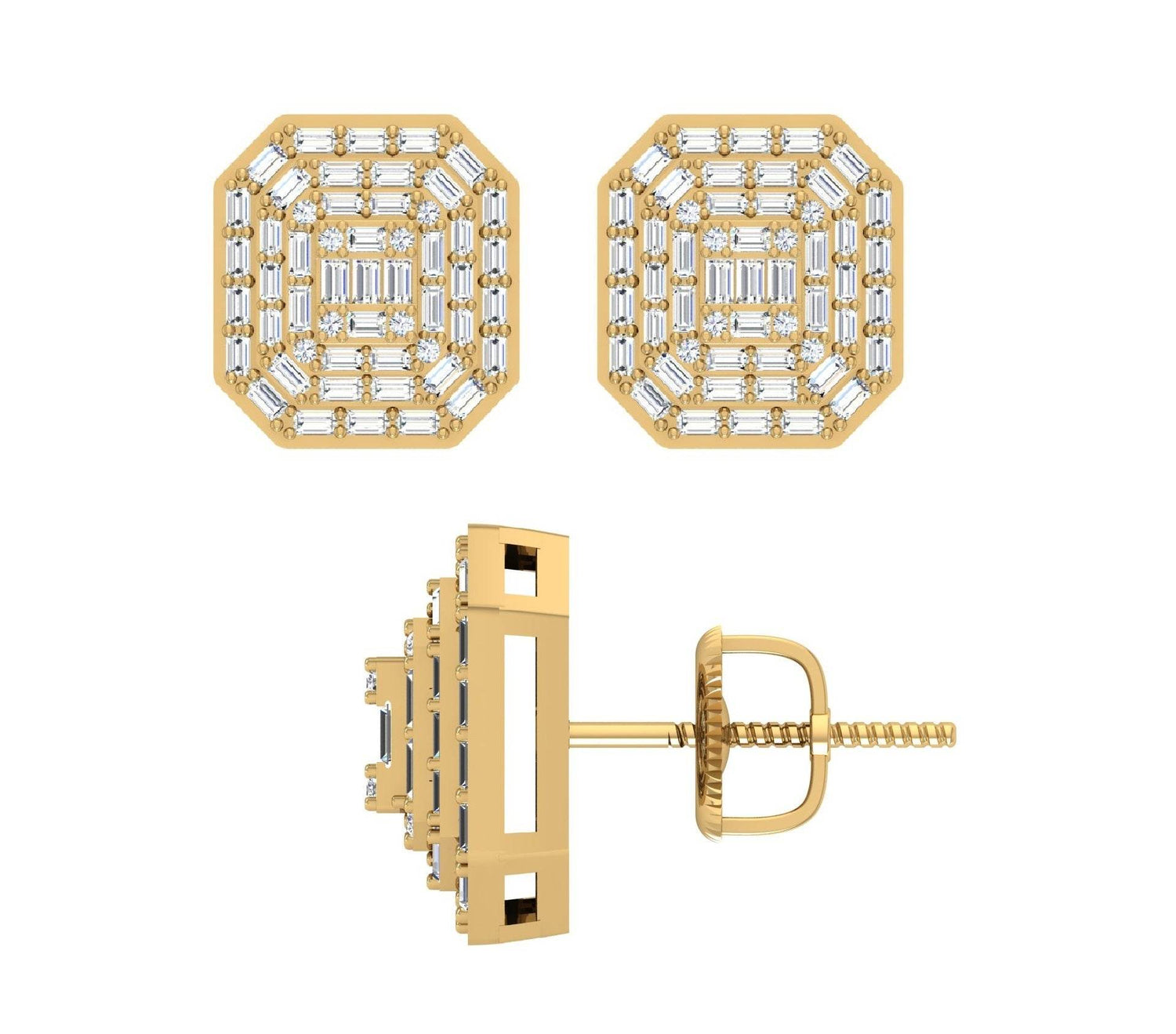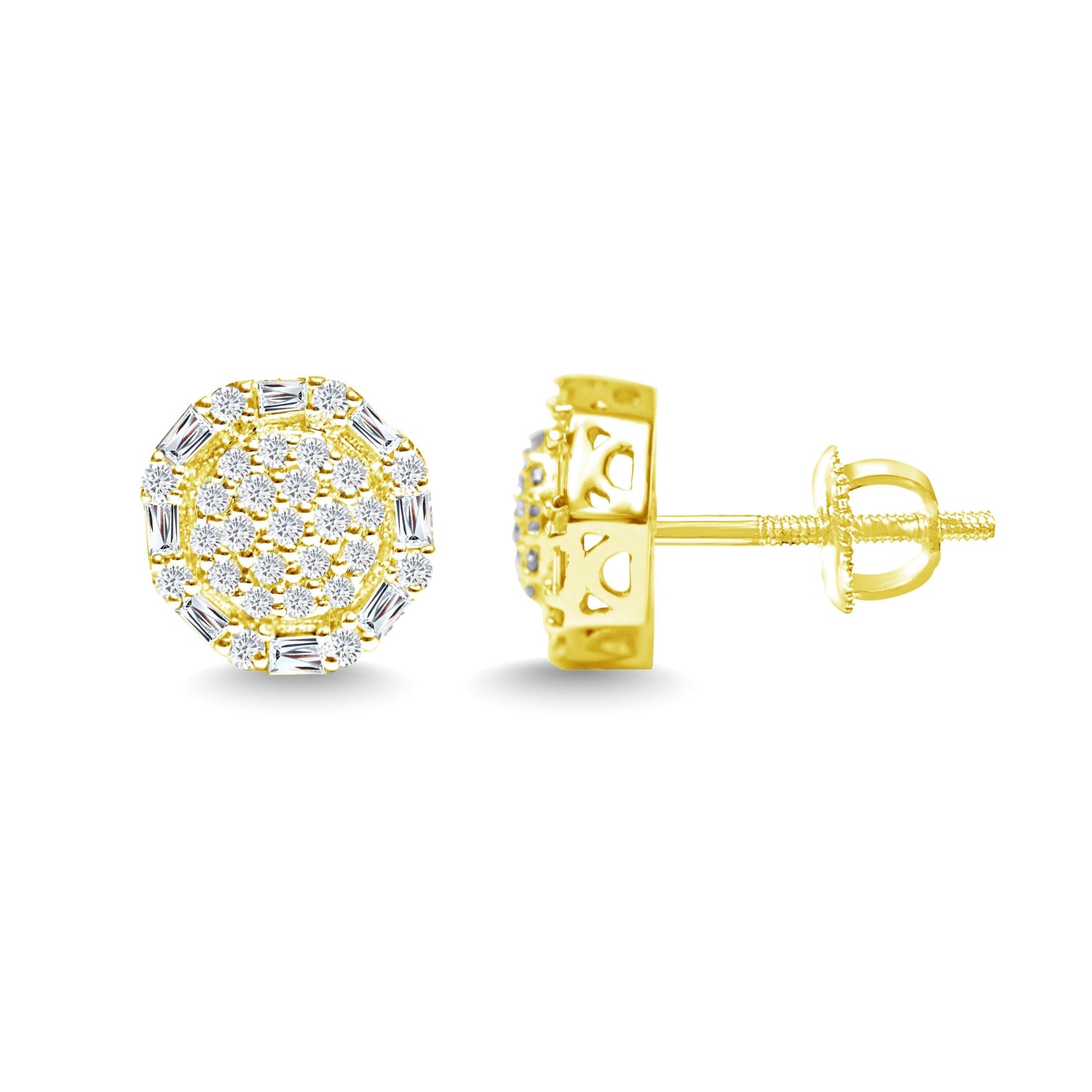 Unit price perThis pair of earrings is made entirely of solid 10 Karat Yellow gold. These studs, which sparkle with brilliant diamonds, are highly polished for a lustrous brilliance. These specific studs have real Baguette and Round cut White diamonds set in Channel and Prong settings to give the impression that they are larger and more glossy.