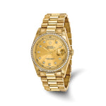 Independently certified pre-owned Rolex Day-Date President in 18K yellow gold. This Swiss-made timepiece features a 36mm case, champagne dial with diamond markers, diamond bezel, and automatic movement with quickset date. Includes 2-year limited warranty and original packaging.